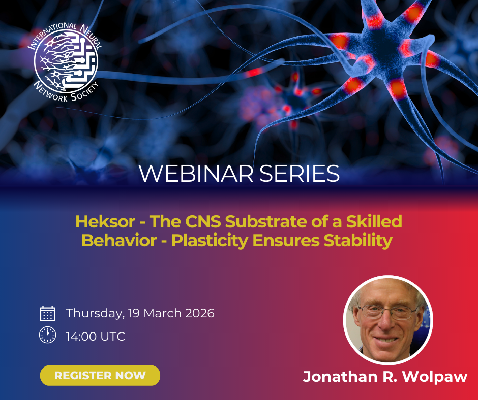 INNS Webinar SeriesWelcome to the INNS Webinar Series. This collection of webinars serves as a virtual learning center for students and professionals to learn and engage in research activities related to neural networks. The portal features lectures from our Webinar Series. You are invited to attend the webinars live, held bi-monthly. Upcoming Webinars![]() Abstract: Recent recognition that the CNS remains plastic through life requires a new paradigm to explain how skills are acquired and maintained in a continually changing CNS. The paradigm’s core is a newly recognized CNS entity, now called a “heksor” from the ancient Greek “hexis” (JPhysiol 2022 DOI:10.1113/JP283291). A heksor produces a skilled behavior (e.g., locomotion). It is a distributed network of neurons and synapses that may extend from cortex to spinal cord. A heksor has two unique properties. First, it changes itself as needed to maintain the key features of its skill, the attributes that make the skill satisfactory. Thus, the CNS activity, muscle activity, and kinematics of locomotion may change, but its key features (e.g., upright posture, good balance, right/left symmetry, acceptable metabolic cost) are maintained. Second, through their concurrent changes, the many heksors that share the CNS negotiate the properties of the neurons and synapses they all use. Heksors keep the CNS in a negotiated equilibrium that enables each to maintain its skill. While a heksor’s neurons and synapses change continually through life, the key features of the skill the heksor produces do not change. These key features are the memory of the skill; it is recognizable in the skill the heksor produces. The paradigm eliminates the plasticity vs. stability problem that has been a concern since the time of Plato and remains a concern for artificial neural networks (ANNs). In the new paradigm, plasticity and stability no longer oppose each other. As the CNS changes with new learning, growth, aging, and other events, the plasticity of the heksor ensures the stability of the memory. Animal and human studies support this paradigm. It explains otherwise inexplicable results and underlies new therapies now proving successful in people with spinal cord injury, stroke, and other disorders. It makes predictions that can be tested in humans and animals. The first tests are yielding positive results. The paradigm offers new answers to questions such as the generation and function of spontaneous neuronal activity, the etiology of muscle synergies, and the control of homeostatic plasticity, and it indicates the advances needed to make brain-computer interfaces (BCIs) as reliable as muscles. Register NowSpeaker Bio: Dr. Wolpaw is a neurologist who has spent 50 years exploring spinal cord and brain plasticity in animals and humans. His lab originated the protocol for operant conditioning of spinal stretch reflexes. Together with Drs. Xiang Yang Chen, Jonathan Carp, and Yu Wang, he led extensive physiological and anatomical studies that revealed the complex plasticity in spinal cord and brain associated with this ostensibly simple learning. They showed that appropriate reflex conditioning improves walking in rats with spinal cord injuries. With Dr. Aiko Thompson, they found that reflex conditioning improves walking in people with spinal cord injury. This work has led to a new paradigm for how skilled behaviors are acquired and maintained in what is now understood to be a ubiquitously plastic CNS. This new paradigm leads to new therapeutic strategies that are proving successful in clinical studies. Dr. Wolpaw has also been deeply involved in brain-computer interface (BCI) research. He and Dr. Dennis McFarland first showed the value of EEG sensorimotor rhythms for BCI-based communication and control, including multidimensional control. Their group oversaw the first multicenter trial of a BCI for independent home use by people with severe disabilities. They developed and disseminated the general-purpose software platform BCI2000, which has supported nearly 3,000 peer-reviewed studies world-wide. They organized the first four international BCI conferences, contributed greatly to the first BCI textbook (Wolpaw & Wolpaw 2012), and are now involved in editing the second edition. Dr. Wolpaw’s research has been supported for over 40 years by NIH, the VA, DARPA, and private foundations. He is Director of the NIBIB/NIH-funded National Center for Adaptive Neurotechnologies (NCAN) and Professor of Biomedical Sciences at the State University of New York. His group’s work has been described in many papers, invited presentations, and lectureships, and recognized by national and international awards. Many students and postdocs have participated and received appropriate recognition. He has contributed to the national and international scientific communities by serving on many advisory committees and review panels and was the first president of the BCI Society. Catch Up on Our Latest WebinarMarkus Krebsz: